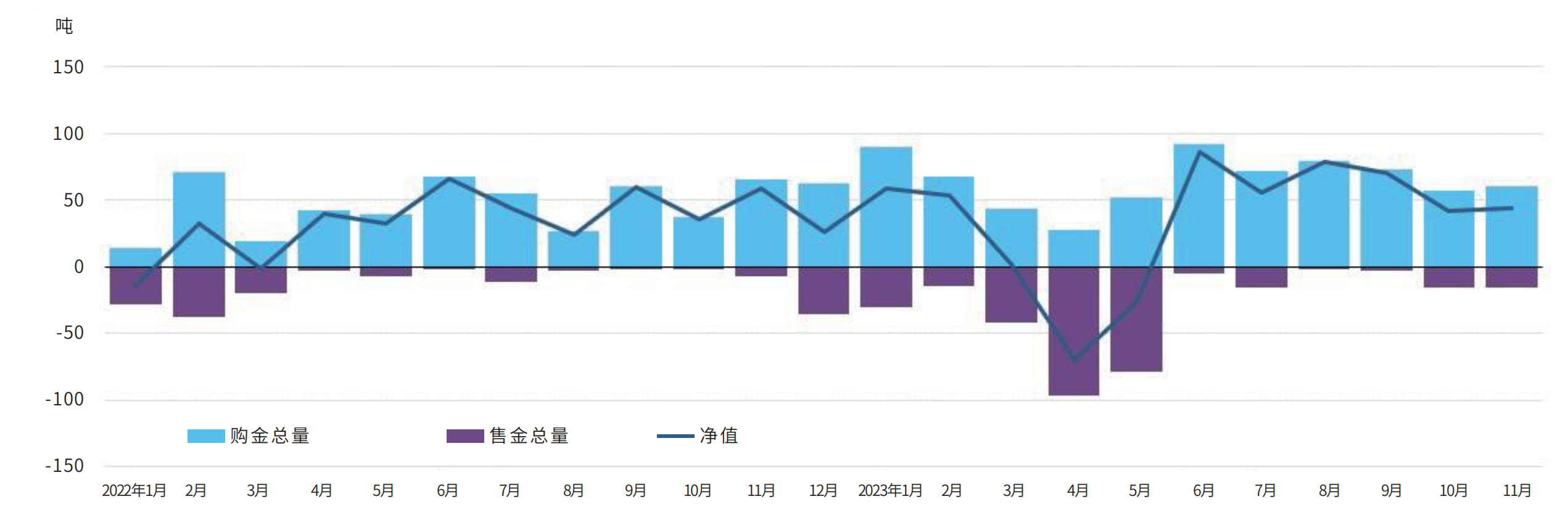 - 由于全球央行持续购金态势,11月购金总量(60吨)远超售金总量(15吨)