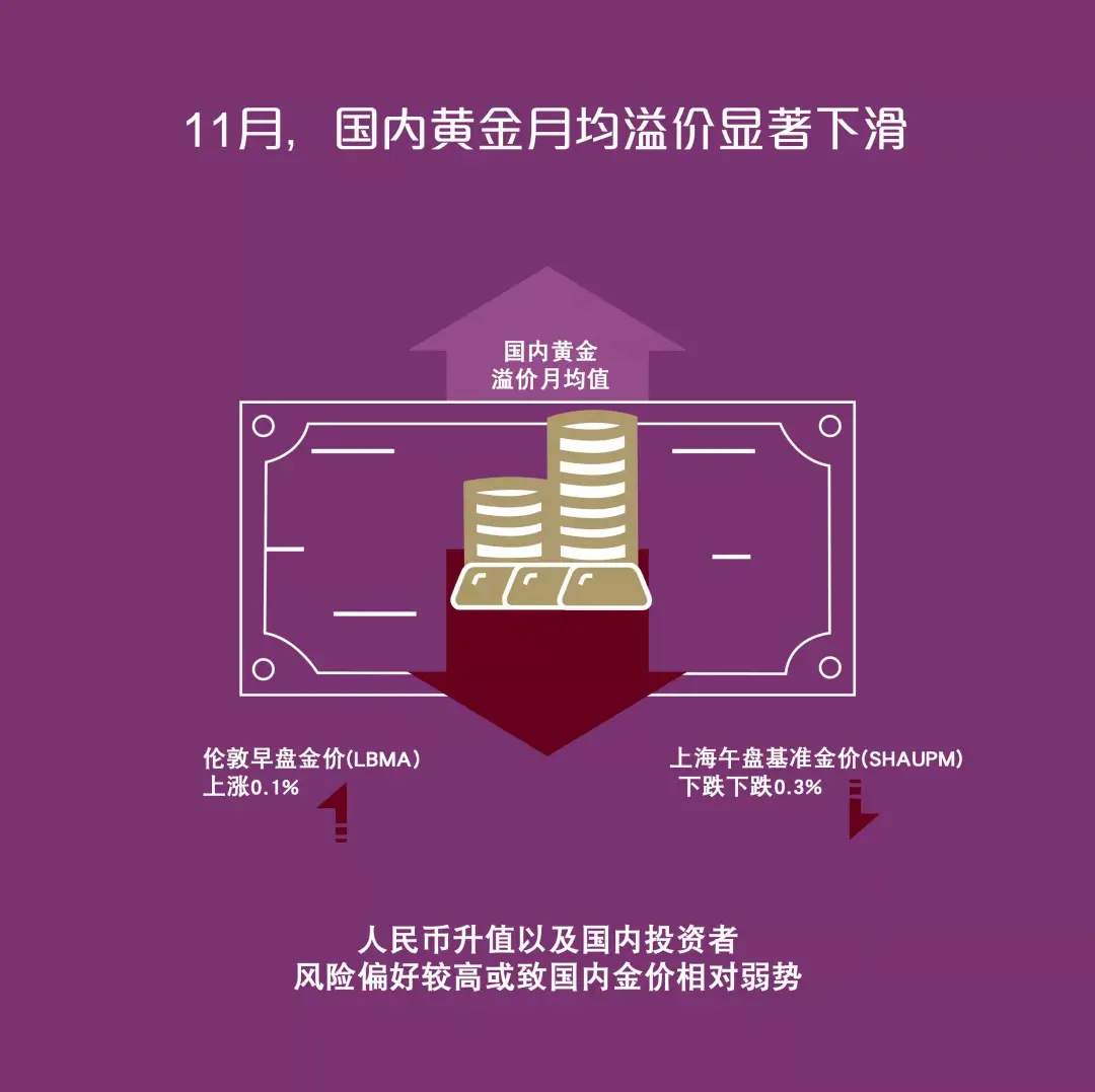 尽管实物黄金需求强劲,但国内金价相对国际表现弱势,令11月的平均国内黄金溢价下降至3美元/盎司,低于10月份的7美元/盎司。更详细的需求分析请见下文。