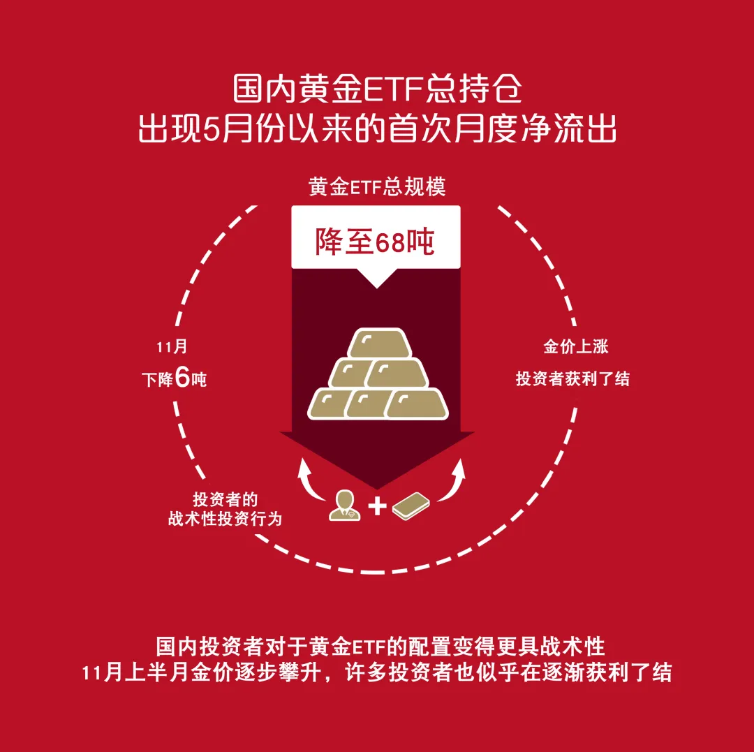 随着去年金价的强劲上涨势头逐步冷却,国内投资者对于黄金ETF的配置变得更具战术性,11月上半月金价逐步攀升,许多投资者也似乎在逐渐获利了结: