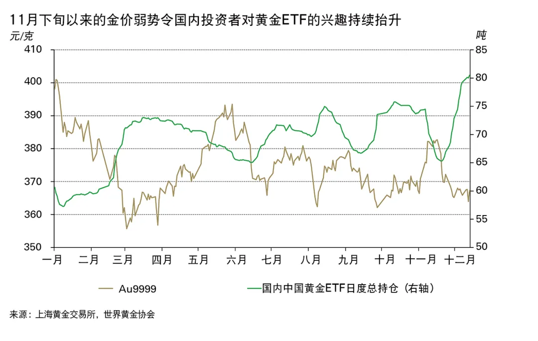 或许是由于11月下半月金价的疲软,投资者重拾对黄金ETF的投资兴趣。由于金价的相对低位持续,国内投资者不断以低价入市,12月中国的黄金ETF总规模不断上升,截至12月16日,其总持仓已超过80吨,为历史最高。