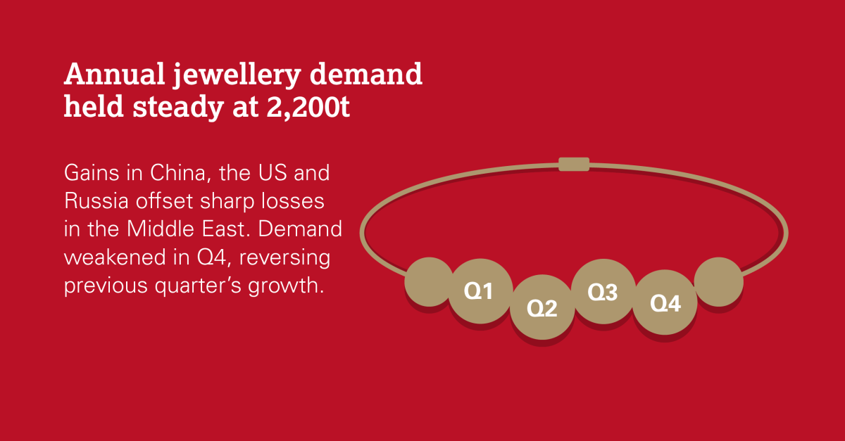全年金饰需求为2,200吨,保持稳定,但第四季度表现疲软