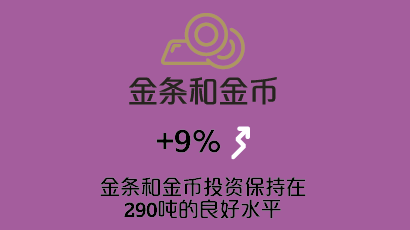 金条和金币投资同比增长9%。主要增长来自中国,投资需求上涨30%,是历史上第四次突破100吨。