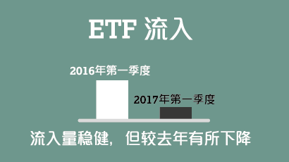 2017年第一季度的全球黄金总需求为1,034.5吨,同比下降18%, 这主要是因为2016年第一季度是有数据来需求最旺盛的第一季度。黄金ETF共增持109.1吨,虽然保持稳定,但较去年接近历史记录的规模仍相去甚远。各大央行购买量的减缓也加剧了疲软态势。不过,金条和金币的需求稳健,同比增长9%至 289.8吨;金饰和科技行业的需求则略有提升。