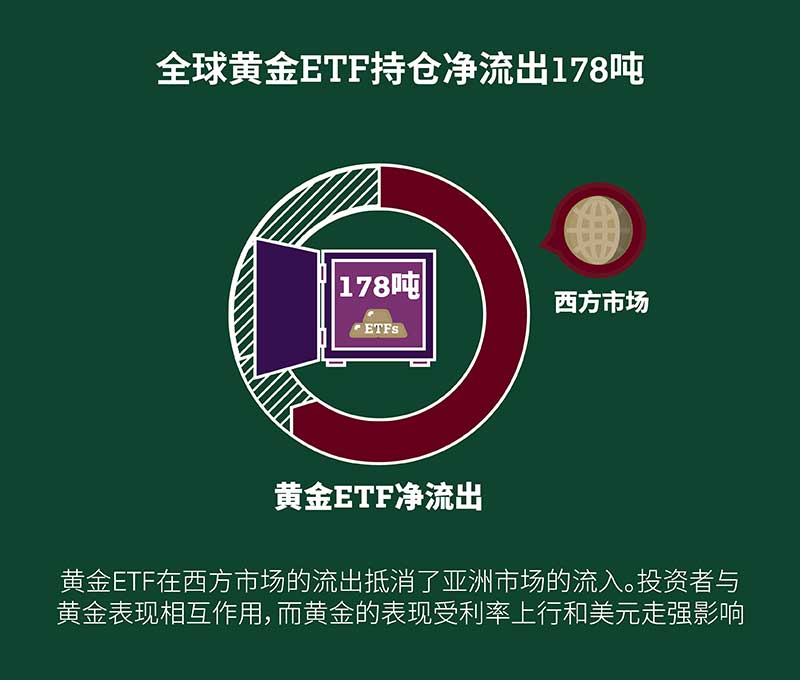 黄金ETF的显著流出抵消了消费需求的强劲增长。利率上升及金价的下跌趋势抑制了部分投资者对黄金的兴趣,全球黄金ETF在第一季度净流出177.9吨。