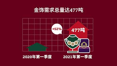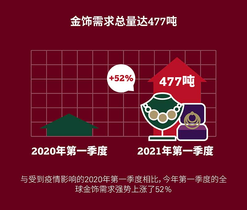第一季度金饰需求为477.4吨,同比上涨52%,较疲弱的2020年第一季度有明显提升。以金额计,全球金饰需求达275亿美元,是2013年以来最高的第一季度总额。