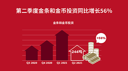 金条和金币投资量已连续第四个季度出现了强劲的同比增长:第二季度需求为243.8吨,将上半年总需求量推升至594吨,是自2013年以来的最高的上半年需求水平。