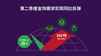 第二季度的全球金饰需求为390.7吨,与饱受疫情困扰的2020年相比持续恢复,但仍远低于疫情前的一般水平,其部分原因是印度市场的需求增长乏力。上半年整体金饰需求为873.7吨,较2015-2019年上半年平均水平下降17%。