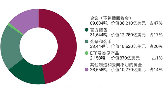 ** 包括金条、金币、以黄金为依托的交易所交易产品和官方储备。