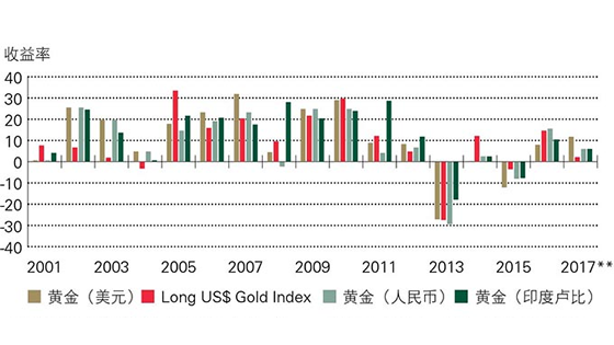 * 基于伦敦金银市场协会下午盘金价,但Long USD Gold Index除外,该指数是基于Solactive GLD® Long USD Gold Index。该指数结合了实物黄金多头头寸和一篮子货币多头头寸,包括欧元(57.6%)、日元(13.6%)、英镑(11.9%)、加元(9.1%)、 瑞典克朗(4.2%)和瑞士法郎(3.6%)。更多细节,请访问: https://www.solactive.com/complex-indexing/?index=DE000SLA2K90.