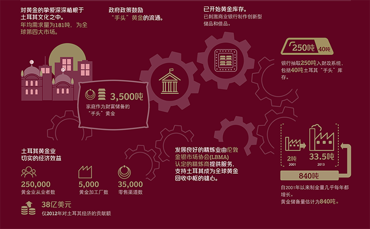 - 黄金的价值链为土耳其经济作出了巨大的贡献。 仅2012年,黄金制造[1]、黄金消费和再生金就为土耳其经济创收至少38亿美元。该价值链帮助到了5,000家黄金制造商、35,000家零售店,以及约250,000的就业人员。