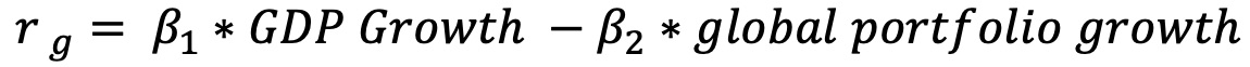 金价与GDP和全球投资组合之间的关系可扩展为收益关系。这就将这些水平要素转换并简化为以下关系:
